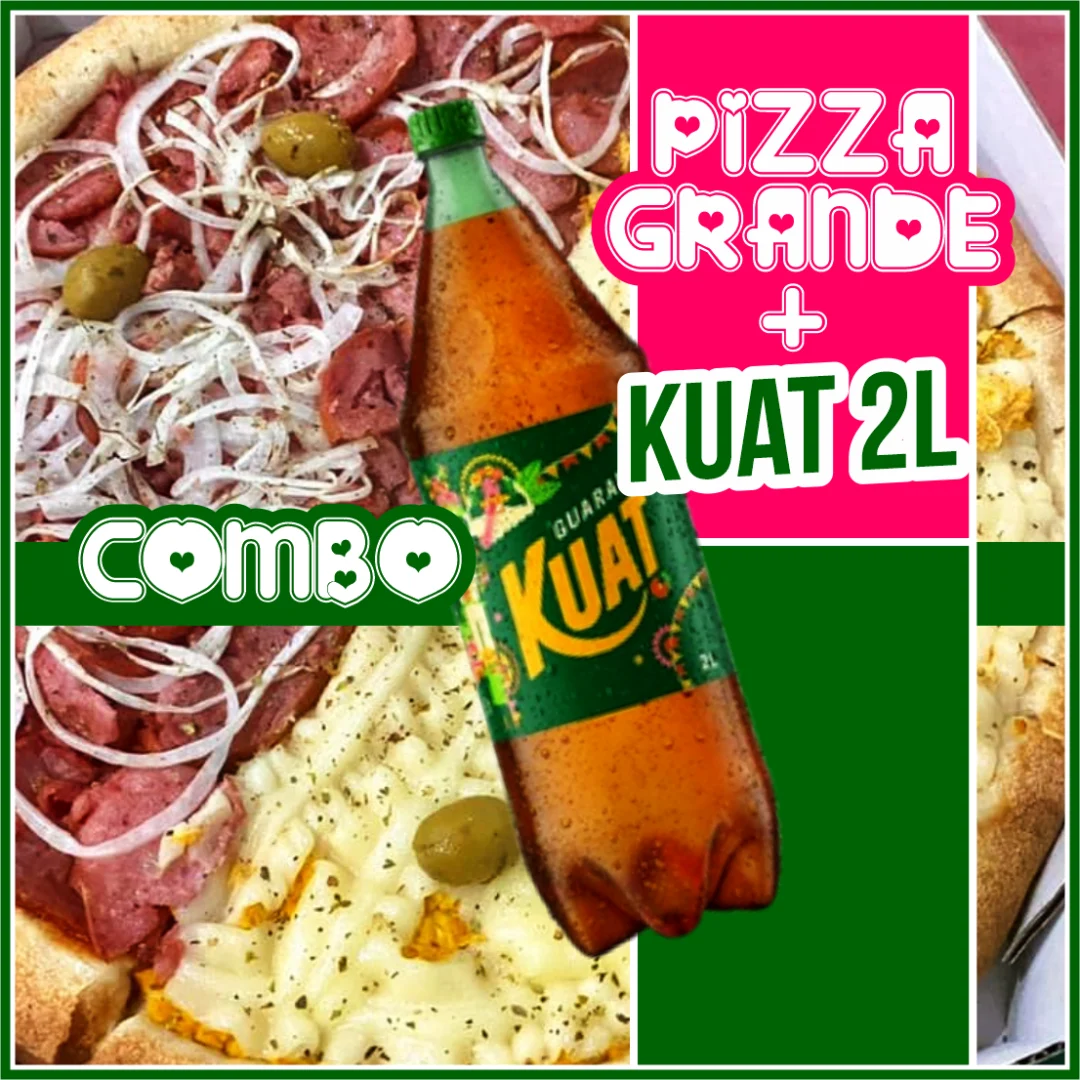 Nosso combo e composto por uma pizza de 35 cm 8 fatias, + Borda Requeijão Cremoso (com amido) Grátis + 1 Kuat 2l Grátis.